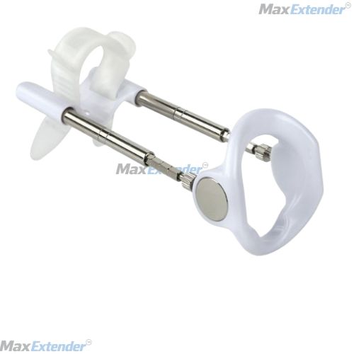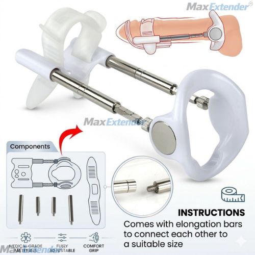 MaxExtender™ Penis Extender Gen 2 — Medically approved penile traction device for permanent enlargement and Peyronie's correction. Includes comfort strap, 3 extension bar pairs, carry case and instructional guide.